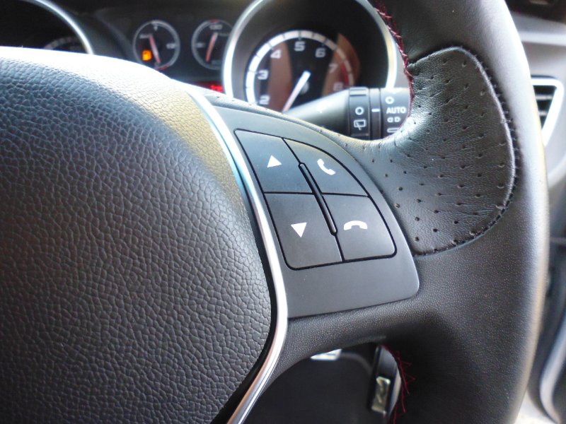 - Flat bottom sports leather steering wheel with red stitching + Phone and radio controls